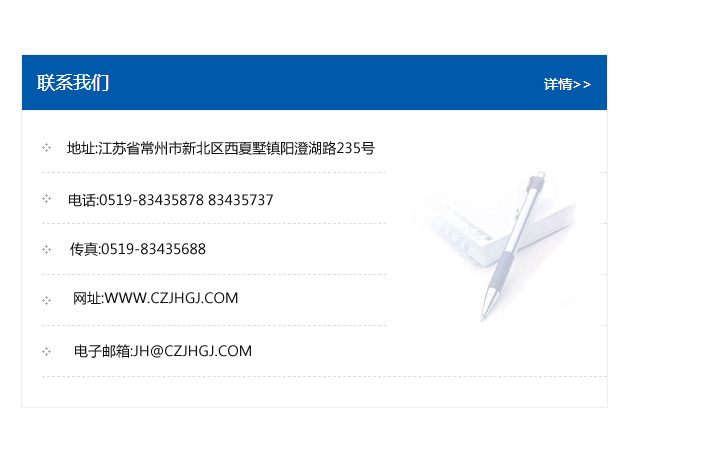 地址:常州市新北區友邦商務大廈1幢16、17層  電話:0519-85101652  傳真:0519-85112595  郵編:213022  網址:www.cz-jiayue_cn.ycchixicha.com  郵箱:xiajifengaa@163.com